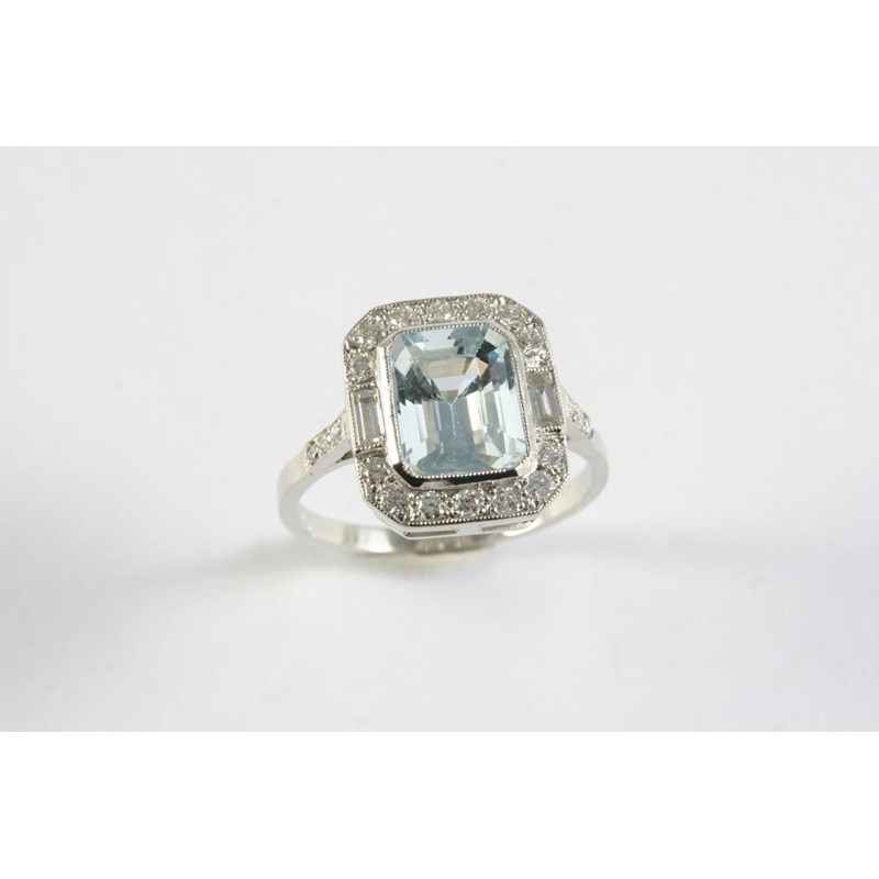 the step-cut aquamarine is set within a surround of two baguette-cut and fourteen circular-cut diamonds, with three further diamonds set to each shoulder, in platinum. Size K