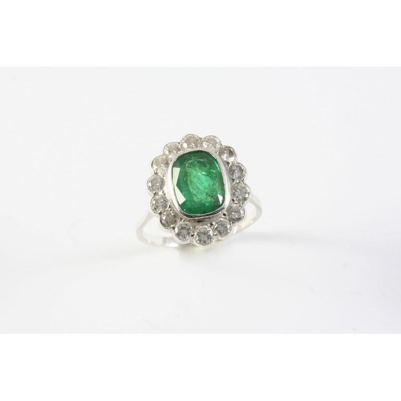 AN EMERALD AND DIAMOND CLUSTER RING the oval-shaped emerald is set within a surround of fourteen circular-cut diamonds in platinum. Size S