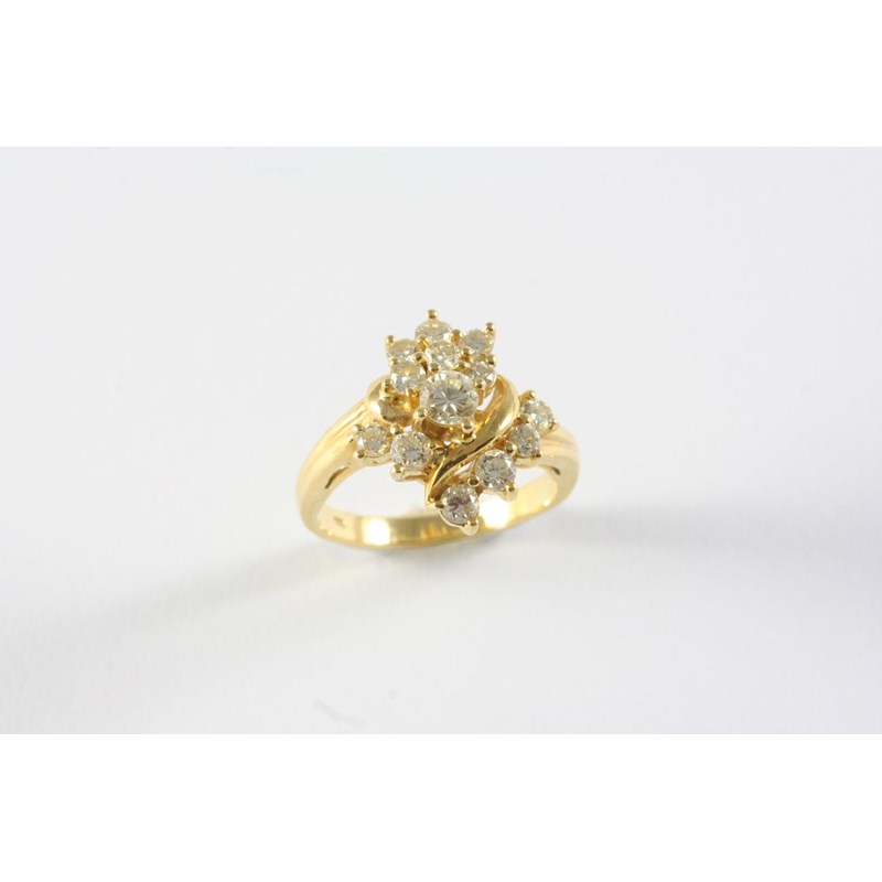A DIAMOND CLUSTER RING mounted with graduated circular-cut diamonds in 18ct gold. Size M