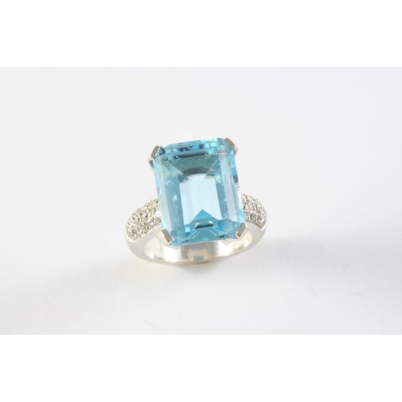 AN BLUE TOPAZ AND DIAMOND CLUSTER RING the step-cut blue topaz is set with three rows of circular-cut diamonds to each shoulder, in white gold. Size L