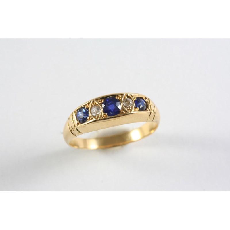 A SAPPHIRE AND DIAMOND FIVE STONE RING the three circular-cut sapphires are set with two circular-cut diamonds in 18ct gold. Size R
