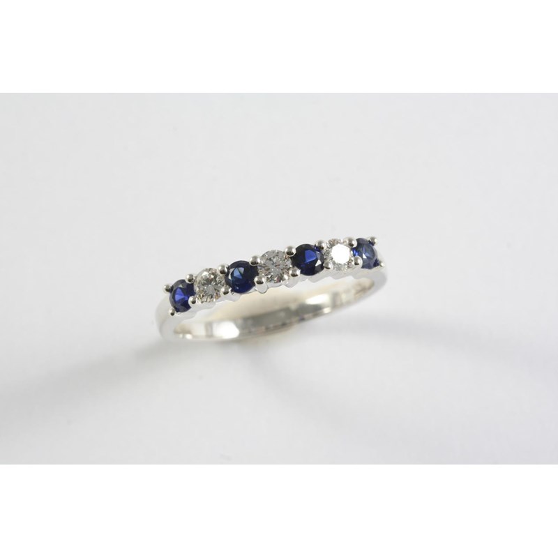 A SAPPHIRE AND DIAMOND HALF HOOP RING the four circular-cut sapphires are set with three circular-cut diamonds, in 18ct white gold. Size N