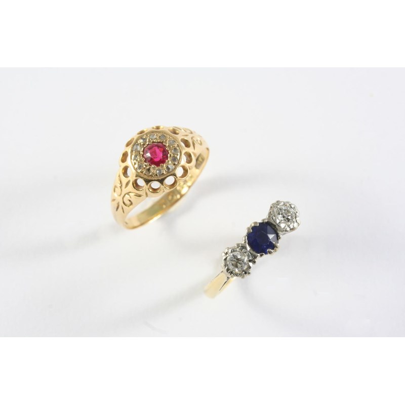 the circular-cut sapphire is set with two circular-cut diamonds in 18ct yellow gold and platinum, size K, together with a ruby and rose-cut diamond cluster ring, set in 18ct gold and hallmarked for Birmingham 1915, size M 1/2