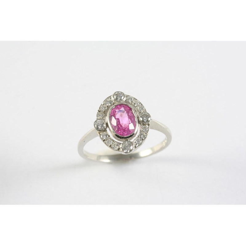 A PINK SAPPHIRE AND DIAMOND CLUSTER RING the oval-shaped pink sapphire is set within a surround of circular-cut diamonds, in platinum. Size O