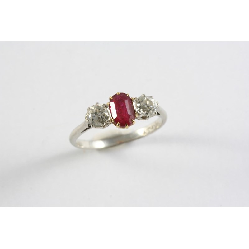 A RUBY AND DIAMOND THREE STONE RING the oval-shaped ruby is set with two circular-cut diamonds in 18ct yellow gold and platinum. Size N 1/2