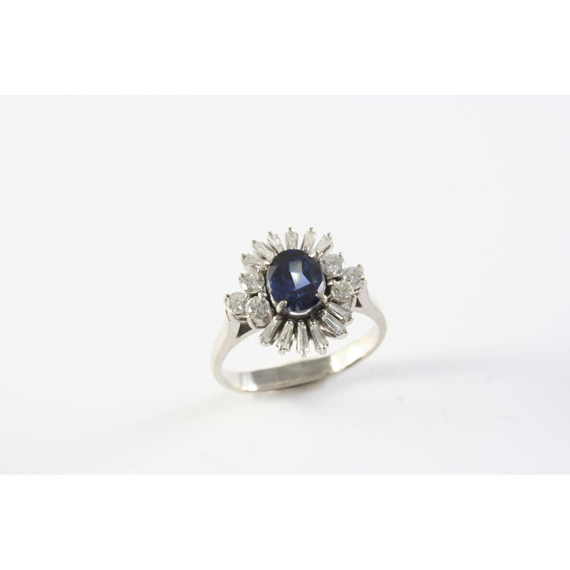 A SAPPHIRE AND DIAMOND CLUSTER RING the oval-shaped sapphire is set within a surround of tapered baguette-cut and circular-cut diamonds, in white gold. Size L