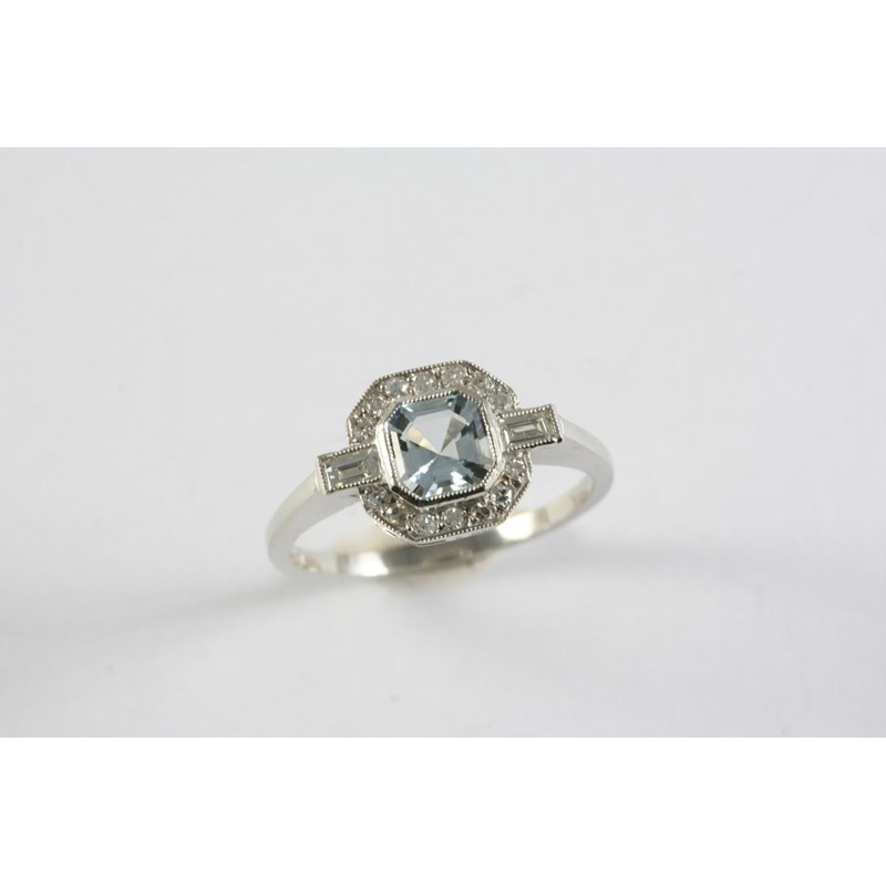 the octagonal-shaped aquamarine is set with two baguette-cut and fourteen circular-cut diamonds in platinum. Size P