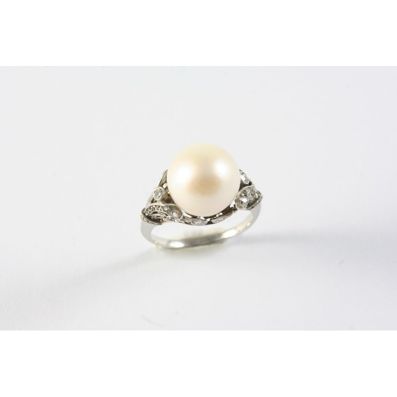 the cultured pearl measuring approximately 11.0mm, in a scrolling openwork mount set with graduated circular-cut diamonds in white gold. Size J