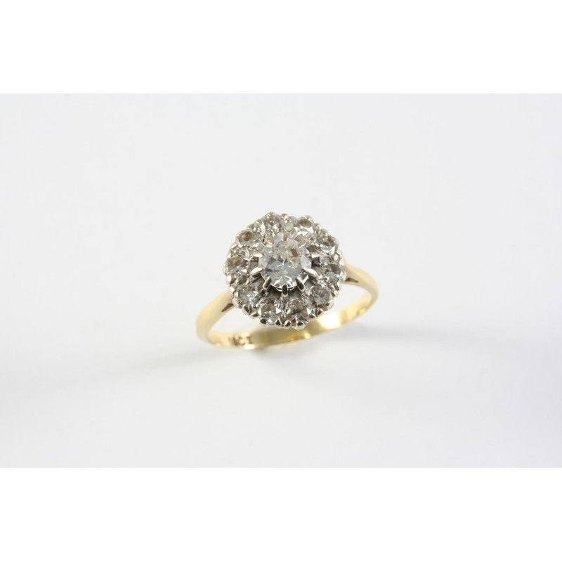 A DIAMOND CLUSTER RING the circular-cut diamond is set within a surround of ten circular-cut diamonds, in 18ct gold. Size P