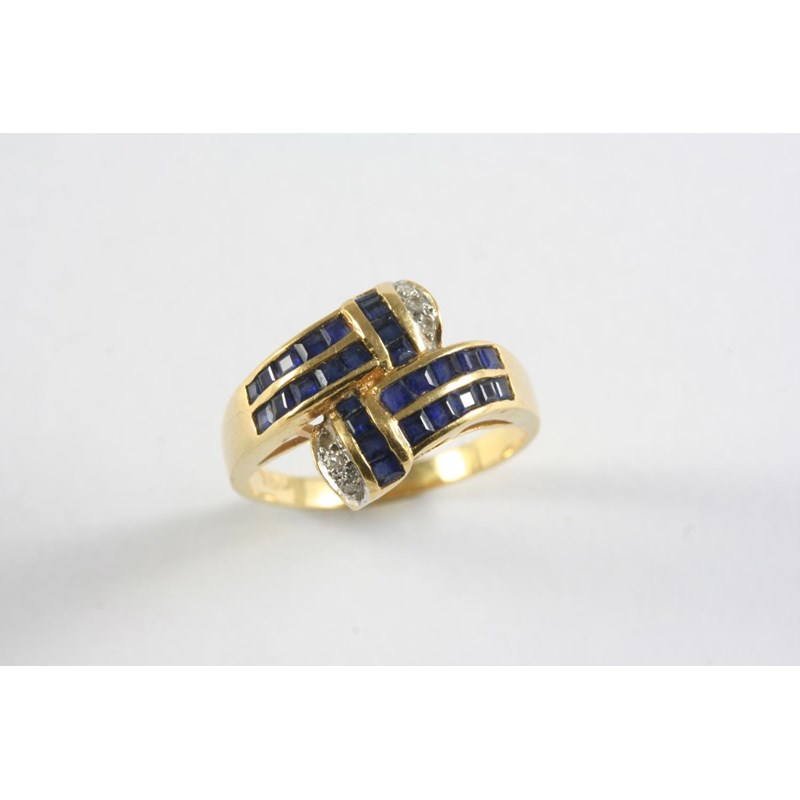 A SAPPHIRE AND DIAMOND CROSS-OVER RING mounted with calibre-cut sapphires and circular-cut diamonds (one diamond missing) in 18ct gold. Size N