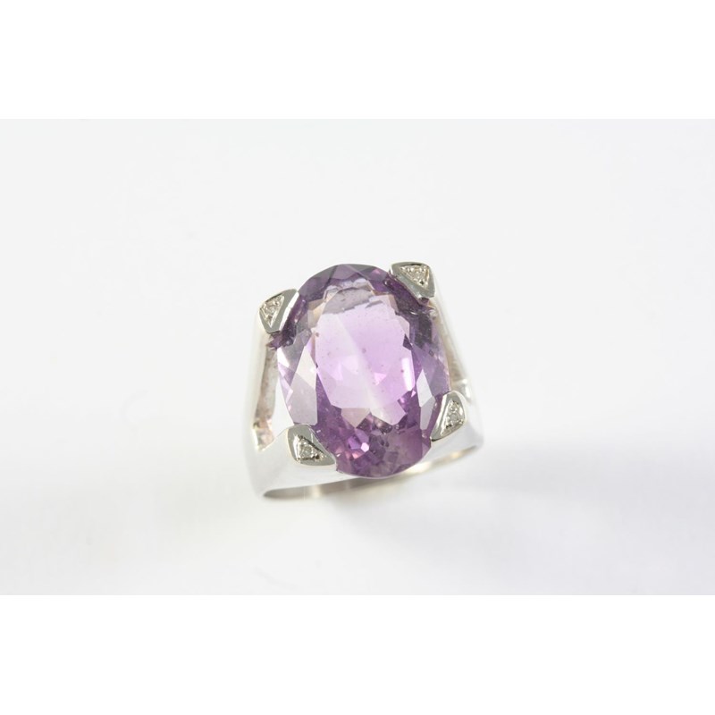 AN AMETHYST AND DIAMOND RING the oval-shaped amethyst is set with a circular-cut diamond to each of the four shoulders, in 18ct white gold. Size O