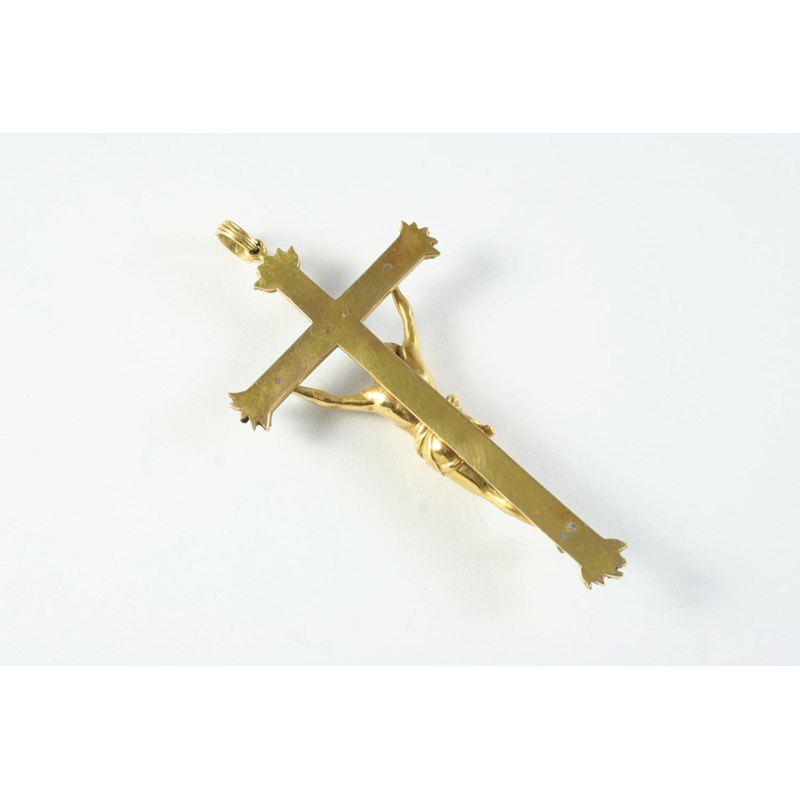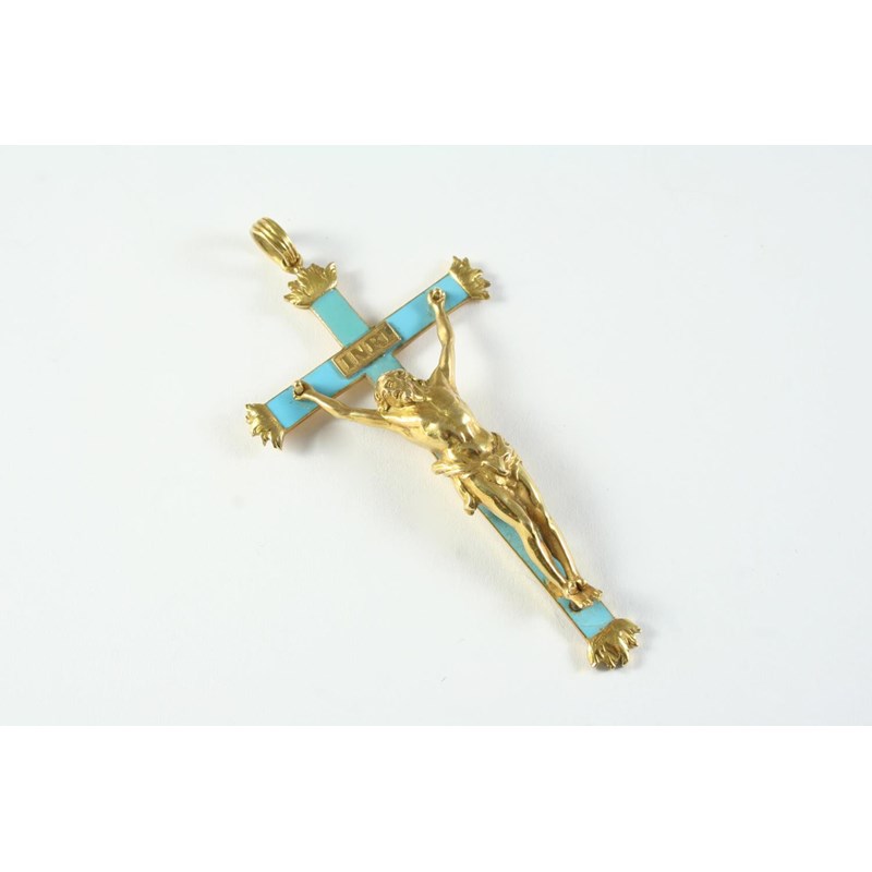 A GOLD CRUCIFORM PENDANT depicting Christ on the cross, with turquoise enamel decoration, 7.5 x 4.2cm not including pendant loop, 31.6 grams