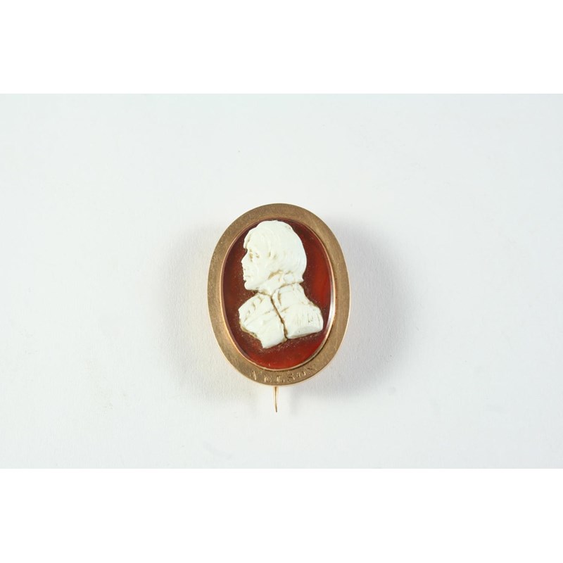 A CARVED SHELL CAMEO BROOCH depicting the bust of Lord Nelson, in a gold mount, the cameo 2.7 x 2.0cm