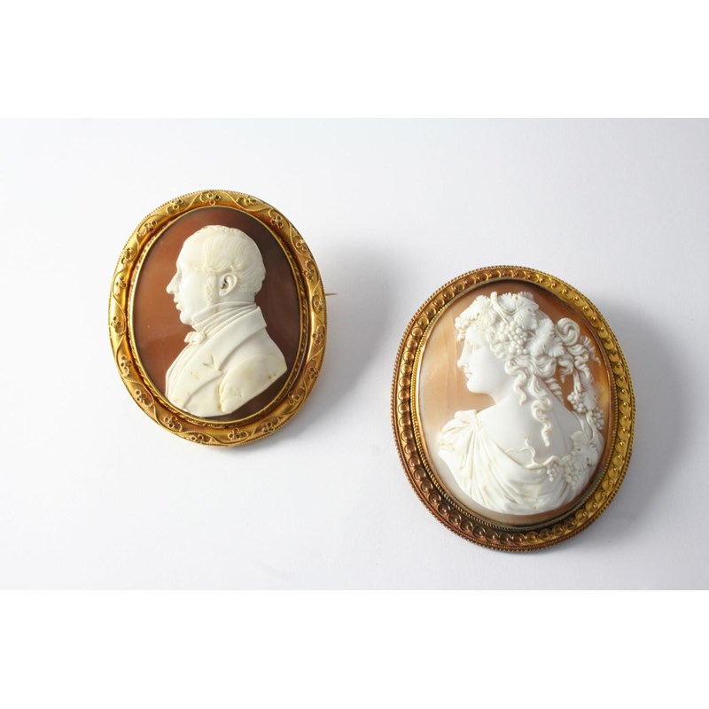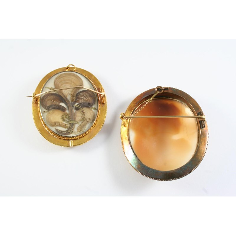 depiciting to one side the profile of a gentleman in formal dress, with locket compartment to the other side containing hair, in an ornate gold frame, the cameo 5.2 x 4cm., together with a Victorian oval carved shell cameo brooch, depicting a bacchante, in an ornate gold frame, 6 x 4.5cm
