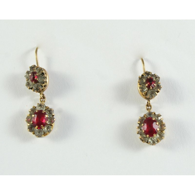A PAIR OF GEORGIAN PASTE SET DROP EARRINGS each set with two red and white paste clusters, in gold closed back settings, 2.5cm long