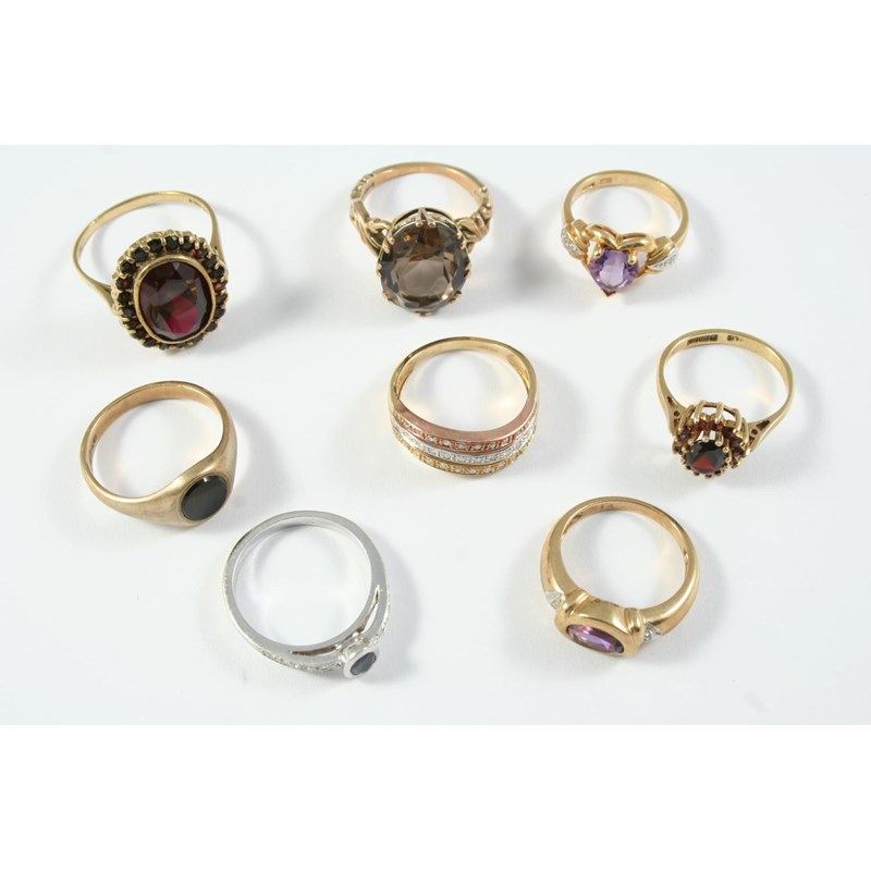 EIGHT ASSORTED GOLD AND GEM SET RINGS