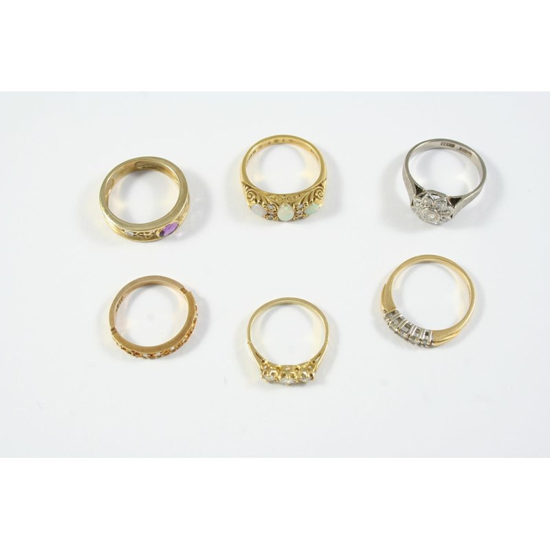 the three solid white opals are set with six circular-cut diamonds in 18ct yellow gold, size O, a diamond cluster ring, set in 18ct white gold and platinum, size M 1/2, a diamond three stone ring, set in yellow gold, size J, a diamond and 18ct gold half hoop ring, size K, a diamond five stone ring, set in 18ct gold, size N 1/2 and a gold openwork ring mounted with an oval-shaped amethyst and two circular diamonds, size M