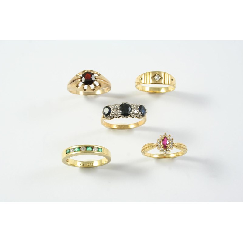 set alternately with circular-cut emeralds and diamonds, in 18ct yellow gold, size N, together with a sapphire and diamond ring, the three oval-shaped sapphires are set with four circular-cut diamonds in 18ct gold, size P, a ruby and diamond cluster ring, set in 18ct yellow gold, size M 1/2, a gold ring mounted with a circular-cut diamond, size L and a garnet and gold ring, size O 1/2