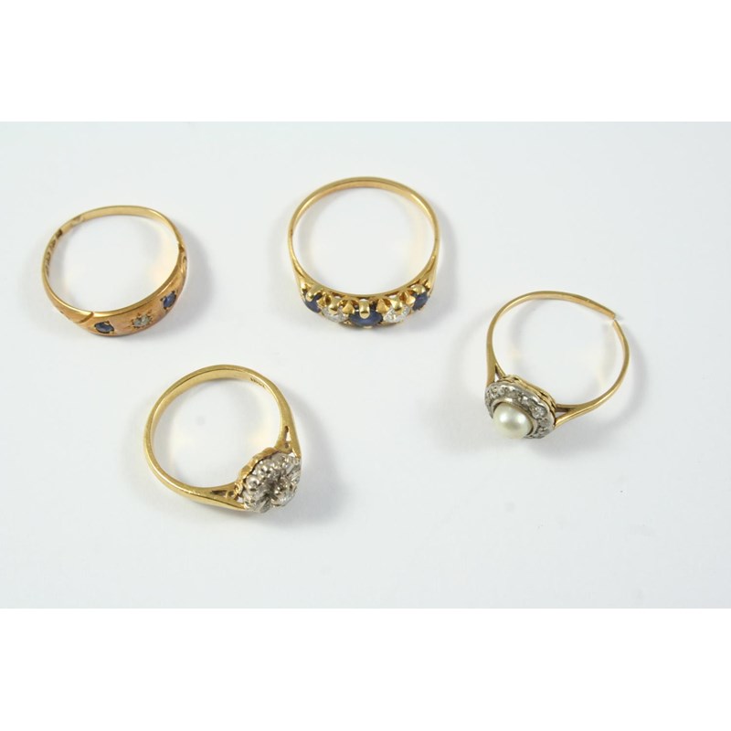 the circular-cut sapphire is set with two oval-shaped sapphires and two old circular-cut diamonds, in 18ct gold, size P 1/2, together with a diamond cluster ring, set with circular-cut diamonds, in 18ct gold, size K, a pearl and diamond cluster ring, the untested pearl is set within a surround of rose-cut diamonds, in gold, shank split, and an 18ct gold ring, set with a circular-cut diamond and two circular-cut sapphires, size M 1/2
