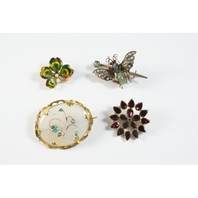 mounted with pear-shaped garnets in gold closed back settings, 3cm dia., together with a Victorian chalcedony and gold brooch with applied turquoise and pearl decoration, 4cm wide, a gold and enamel four leaf clover brooch, with green and yellow enamel decoration, 2.5cm wide and a chrysoberyl cat's-eye and pearl insect brooch, 4.3cm long