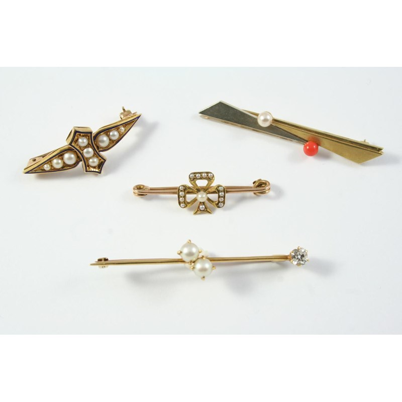 mounted in yellow gold with blue enamel decoration, 3.8cm long, a seed pearl and gold bow brooch, 3.8cm long, a two colour gold brooch mounted with coral and a small pearl, 5.5cm long and a gold brooch mounted with a circular-cut diamond and two untested pearls, 5.5cm long