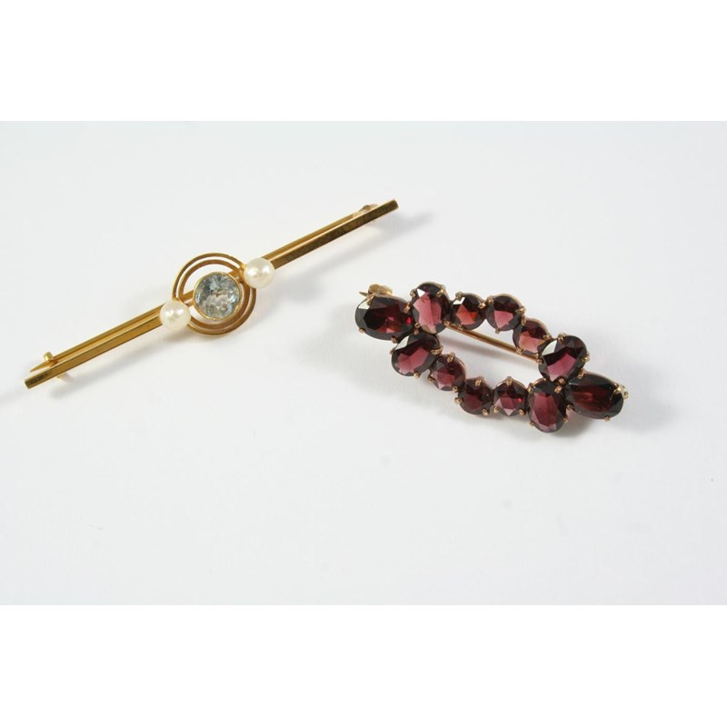 the circular-cut aquamarine is set with two small pearls, in 15ct gold, 6cm long, together with a garnet brooch, set with oval and circular-cut garnets in gold, 3.8cm long