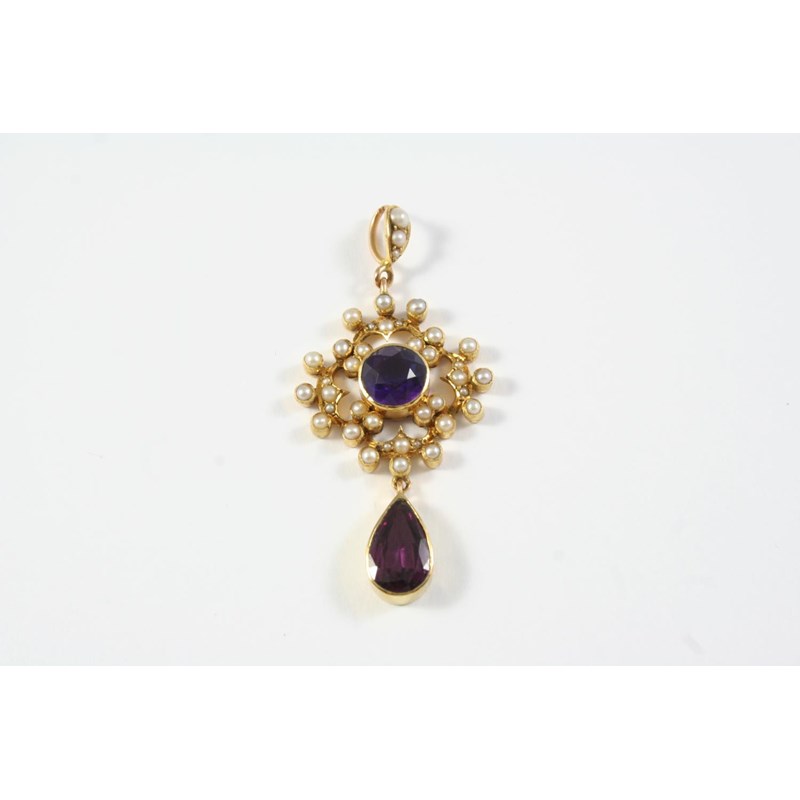 AN EARLY 20TH CENTURY AMETHYST AND PEARL SET PENDANT the circular-cut amethyst is set within an openwork surround of small pearls, suspending an amethyst drop, in yellow gold, 5cm long including pendant loop