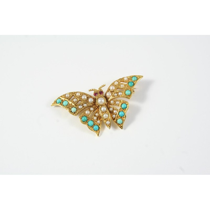 A TURQUOISE AND PEARL BUTTERFLY BROOCH formed with four graduated half pearls to the body, with further half pearls and turquoise cabochons to the wings, with ruby eyes, in gold, 4.2cm wide
