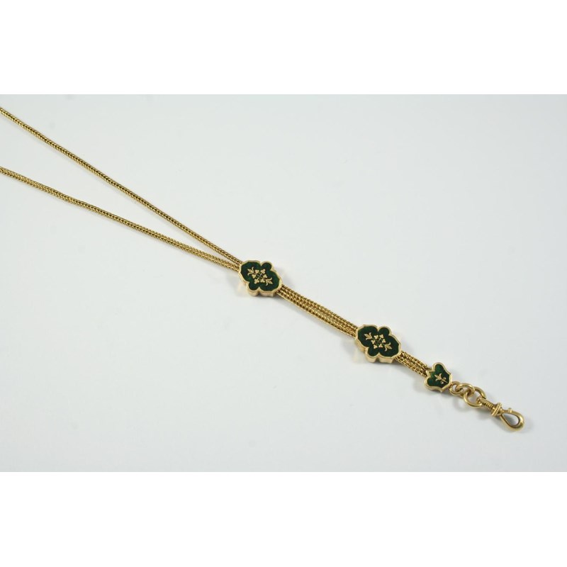 AN 18CT GOLD AND ENAMEL SLIDE CHAIN NECKLACE the herringbone link chain mounted with foliate green enamale slide sections set with rose-cut diamonds, 76cm long, 18.9 grams