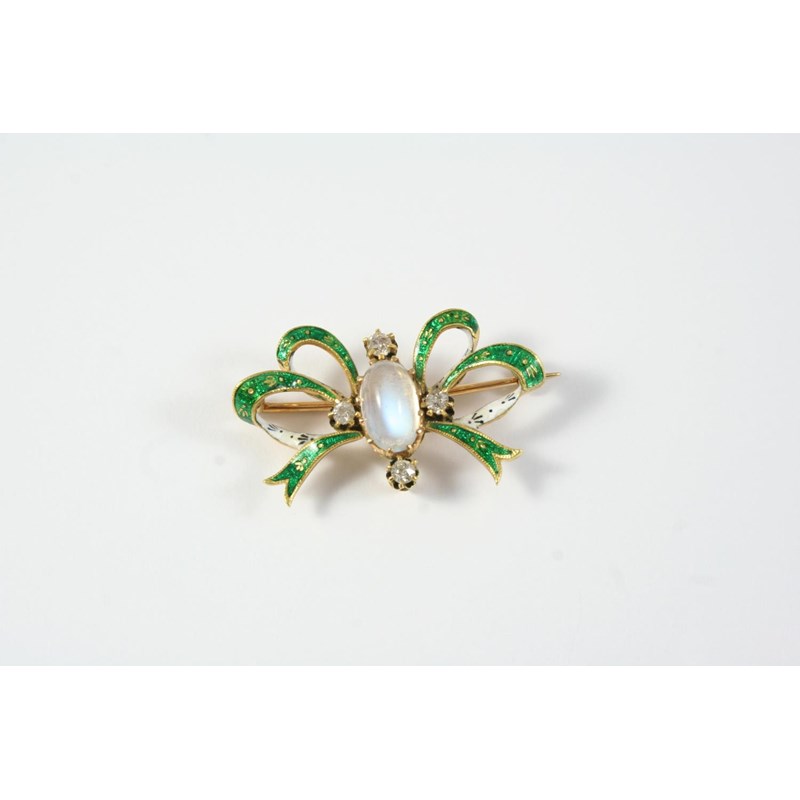 the oval cabochon moonstone is set with four small diamonds, within a ribbon design mount of green and white enamel decoration, in gold, 3.5cm wide