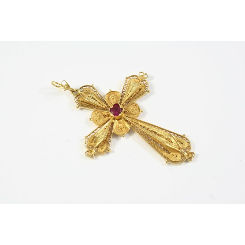 AN 18CT GOLD AND RUBY CRUCIFORM PENDANT the filigree openwork mount is centred with a circular-cut ruby, 6.5 x 4.5cm including pendant loop