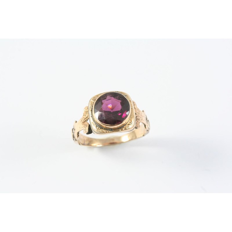 A GARNET SINGLE STONE RING the circular-cut garnet is set in a gold mount with engraved foliate decoration, with further foliate engraving to the bifurcated shoulders. Size P