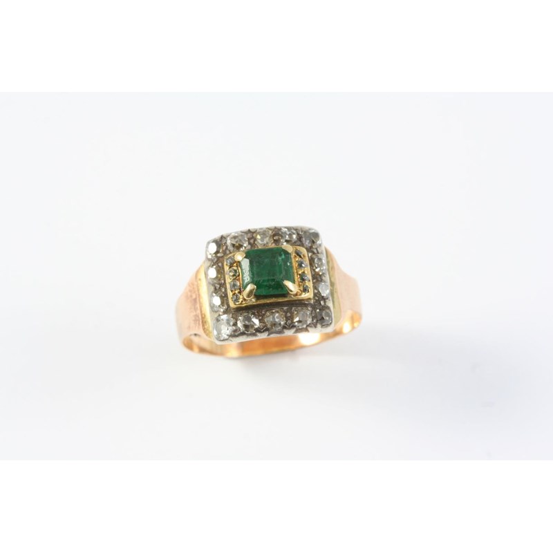 the square-shaped emerald is set within a surround of rose-cut diamonds, in silver and backed in gold, with gold shank, rubbed inscription to the inside shank dated for 18th Jan 1790. Size R 1/2