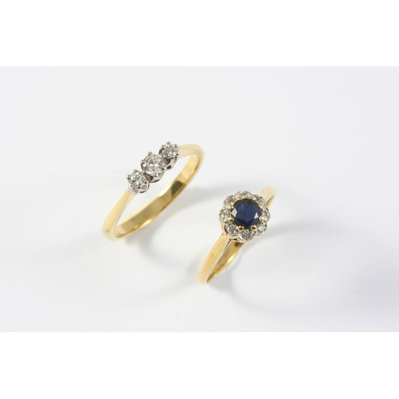the circular-cut sapphire is set within a surround of circular-cut diamonds, in 18ct gold, size M, together with a diamond three stone ring, set with three circular-cut diamonds, in 18ct gold, size O