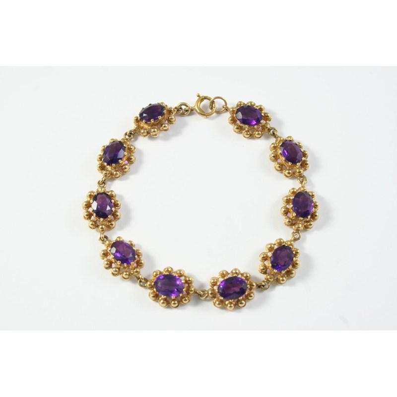 AN AMETHYST AND GOLD BRACELET formed with clusters of oval-shaped amethysts within gold mounts with ball decoration, 17cm long, 15.8 grams
