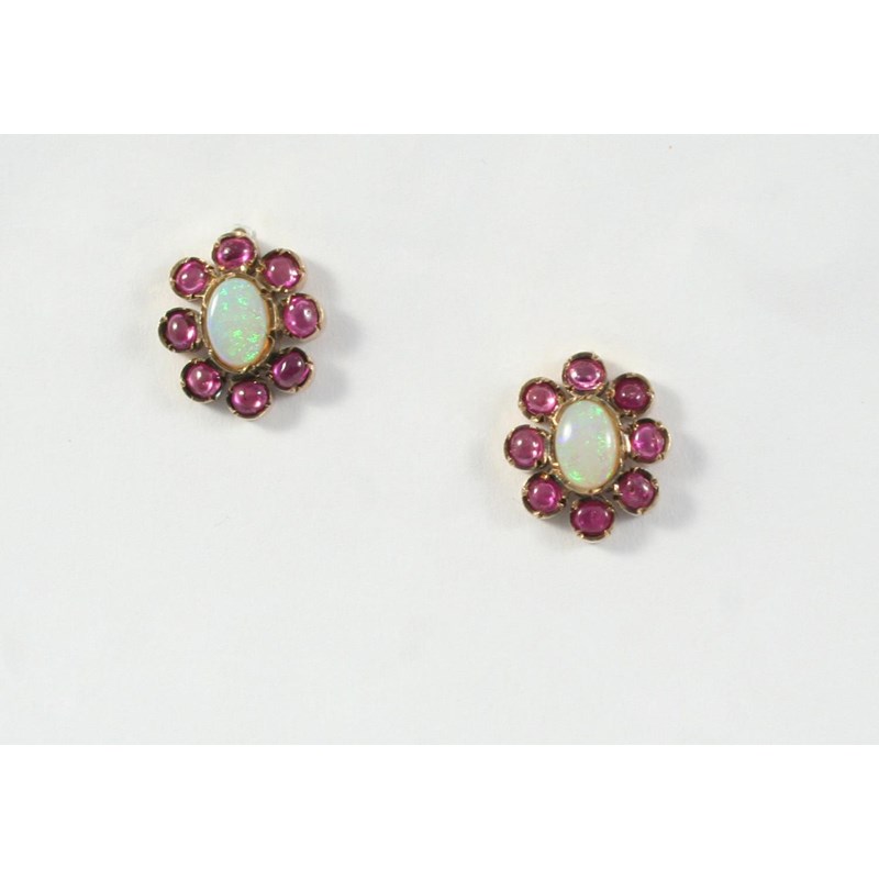 A PAIR OF OPAL AND RUBY CLUSTER STUD EARRINGS each earring set with an oval solid white opal within a surround of cabochon rubies, in gold