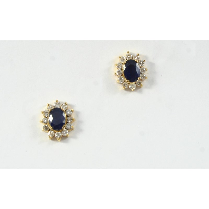 A PAIR OF SAPPHIRE AND DIAMOND CLUSTER STUD EARRINGS each earring set with an oval-shaped sapphire within a surround of circular-cut diamonds in yellow gold