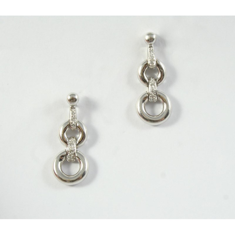 A PAIR OF DIAMOND AND WHITE GOLD DROP EARRINGS each earring formed with two 18ct white gold circles joined together by lines of circular-cut diamonds, 2.5cm long
