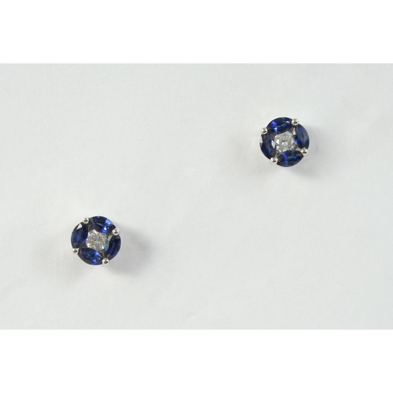 A PAIR OF SAPPHIRE AND DIAMOND STUD EARRINGS each set with a circular-cut diamond within a surround of four marquise-cut sapphires in 18ct white gold