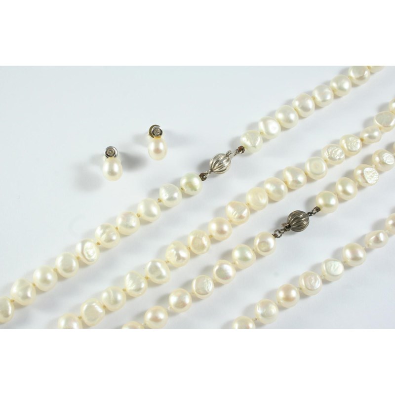 each earring set with a cultured pearl drop suspended from a collet set circular-cut diamond, 1.5cm long, together with two cultured pearl necklaces, both with silver clasps