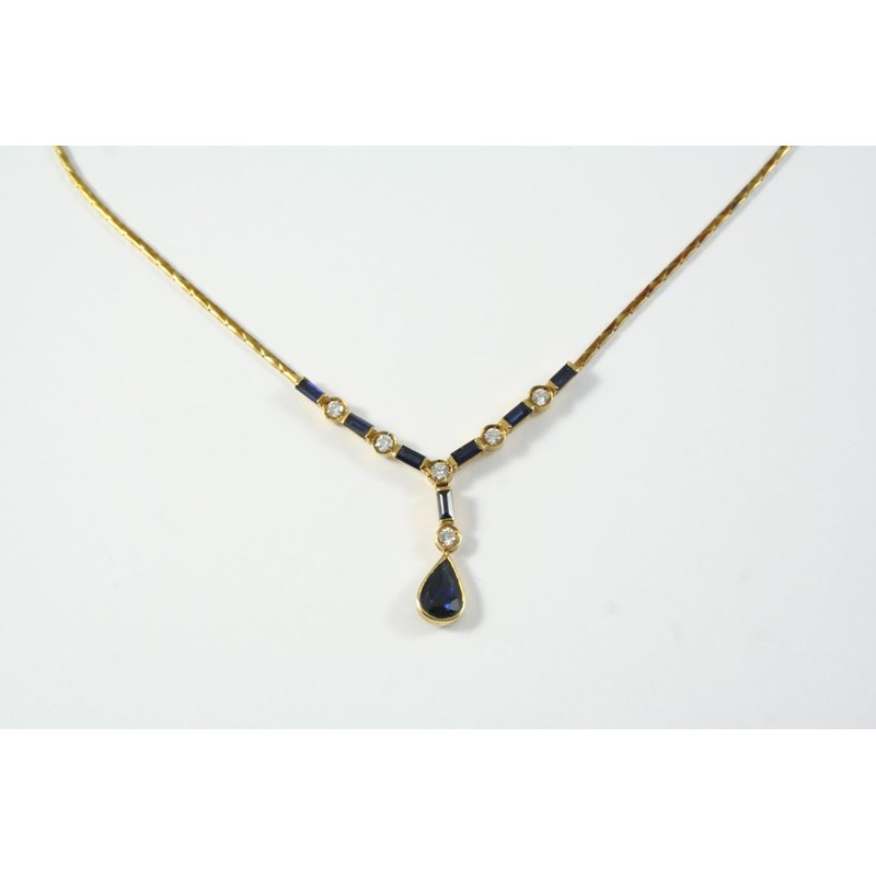 the gold chain necklace is mounted with rectangular-shaped sapphires and circular-cut diamonds, suspending a pear-shaped sapphire drop, 41.5cm long