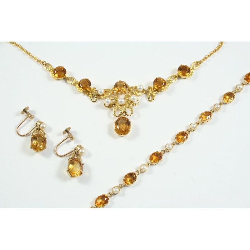 mounted with circular-cut citrines and cultured pearls, in 9ct yellow gold, 47cm long, together with a citrine and cultured pearl bracelet, set in 9ct yellow gold, 20cm long and a pair of citrine and cultured pearl drop earrings, set in 9ct yellow gold, with screw fittings