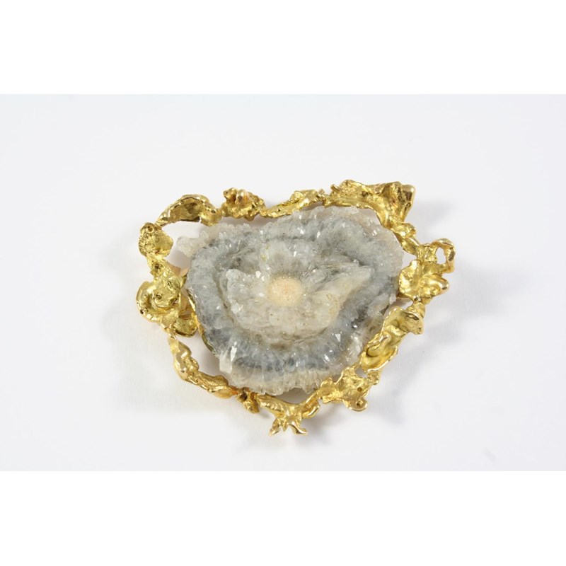 A GOLD AND QUARTZ CRYSTAL BROOCH the irregular section of quartz is mounted in free form 18ct gold border, hallmarked for London 1972, 5.5cm wide