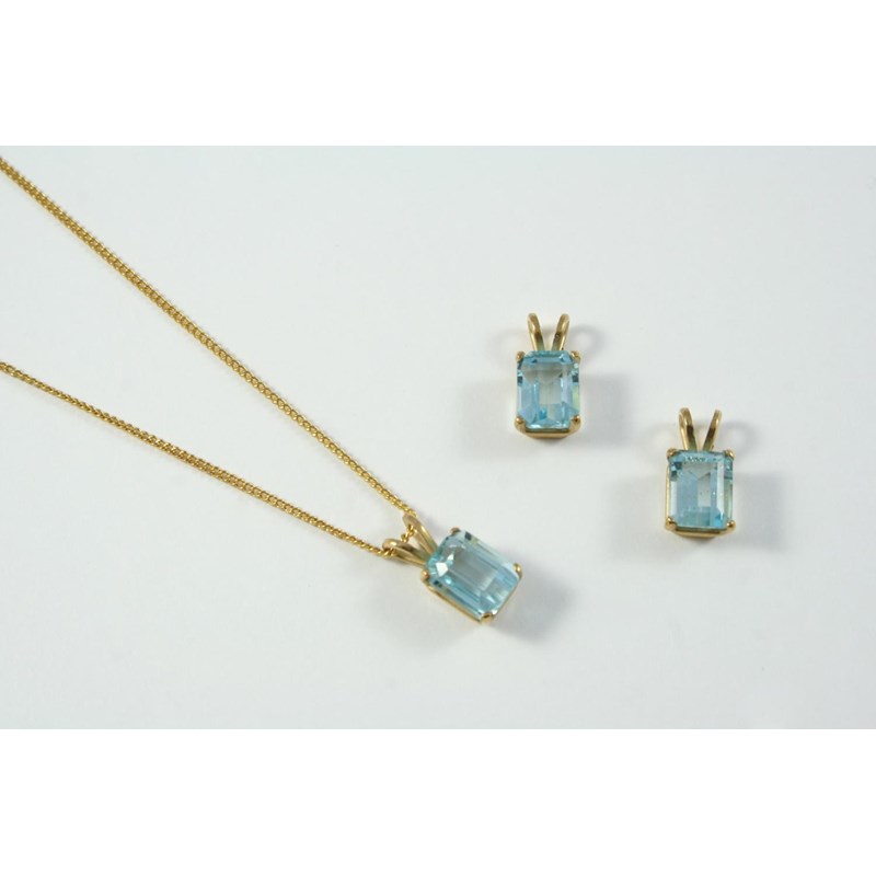 A SINGLE STONE BLUE TOPAZ PENDANT set with a step-cut blue topaz, in yellow gold, together with two other single stone step-cut blue topaz pendants, in gold mounts