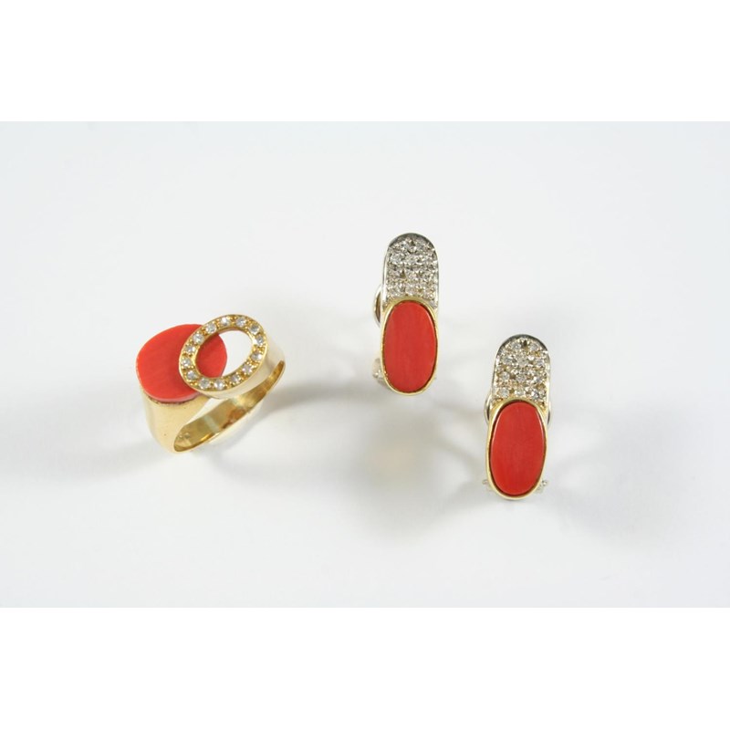 each earring set with an oval-shaped coral and circular-cut diamonds, in 18ct gold, 2cm long, together with a coral and diamond ring, set in 18ct gold. Size M