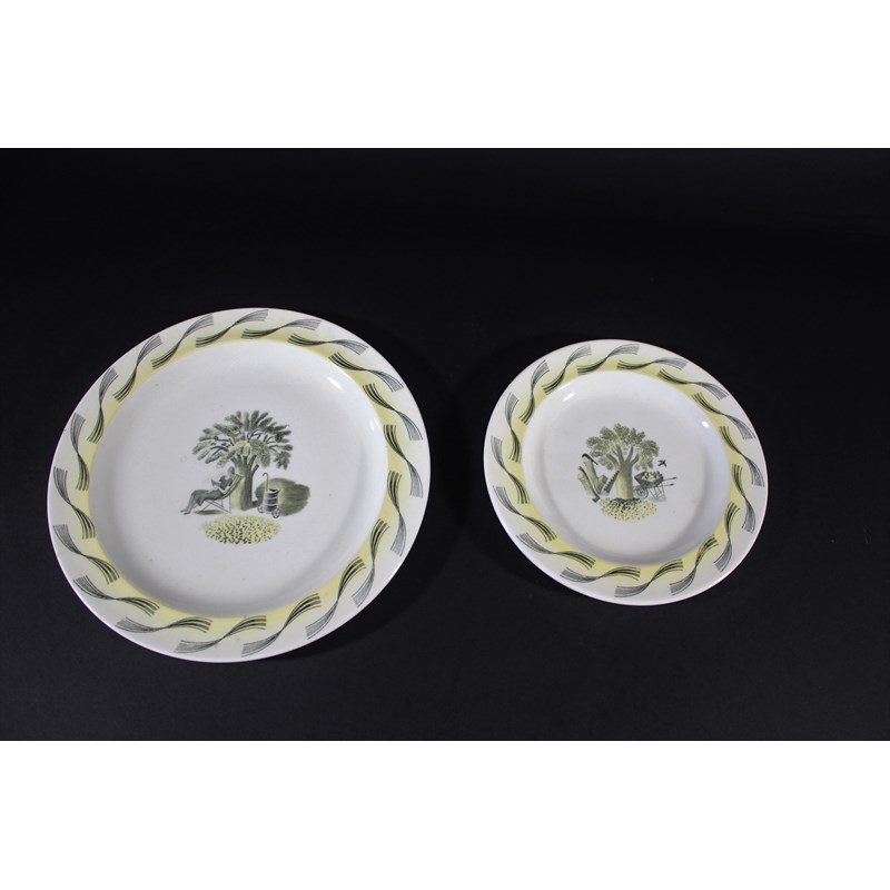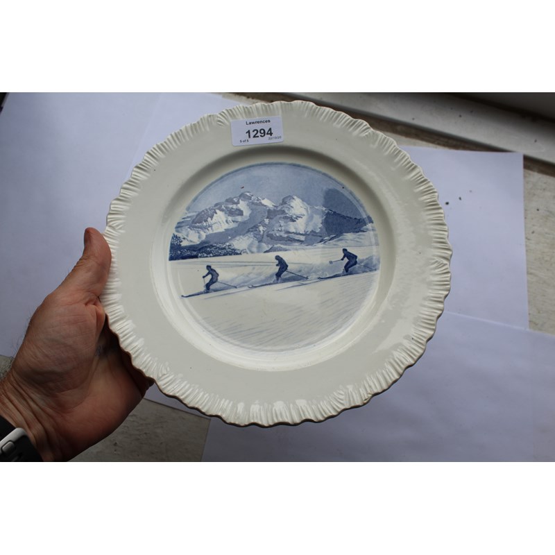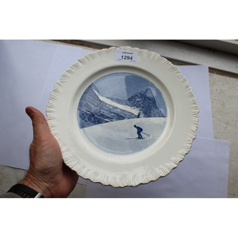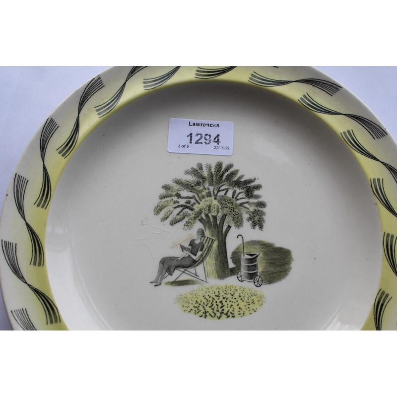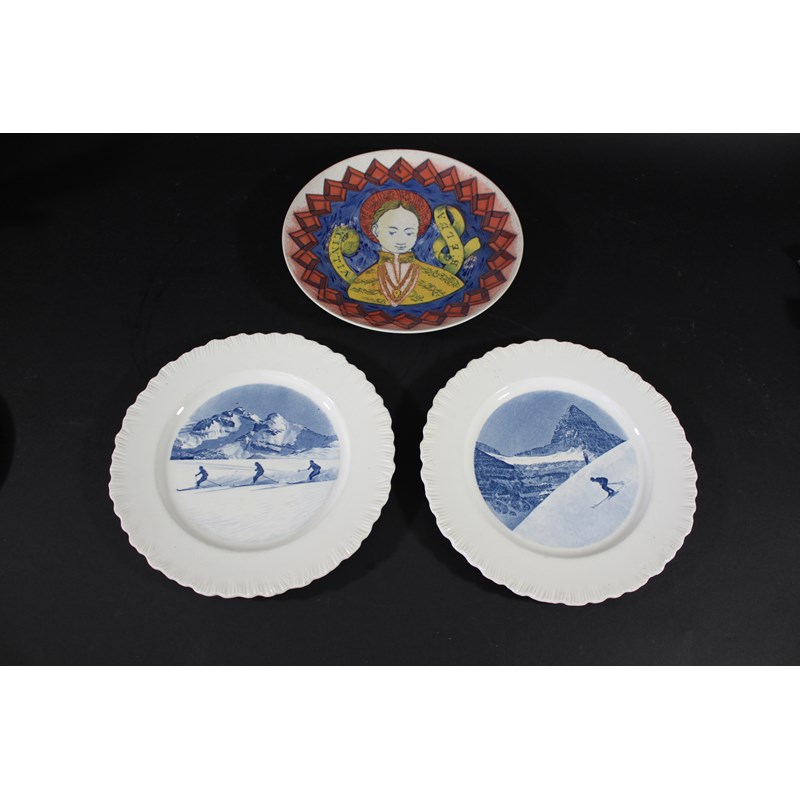 a large plate and a small plate in the Garden design, designed by Ravilious for Wedgwood. Also with 2 Wedgwood plates with Skiing scenes, Sunshine Valley near Banff and Mount Assiniboine, and a Wedgwood plate titled Cintia Bella. Ravilious plates 23cms diameter and 18cms. (5)