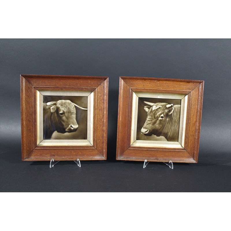 2 monochrome tiles with depictions of Cattle, both mounted in oak frames. Monogram mark to each tile, Frames 27cms square, Tiles 14.5cms. (2)