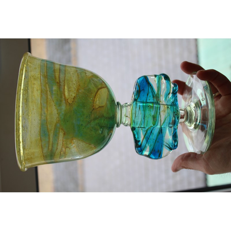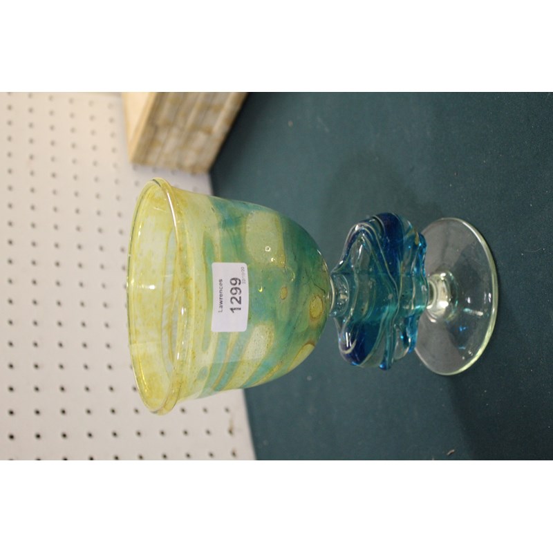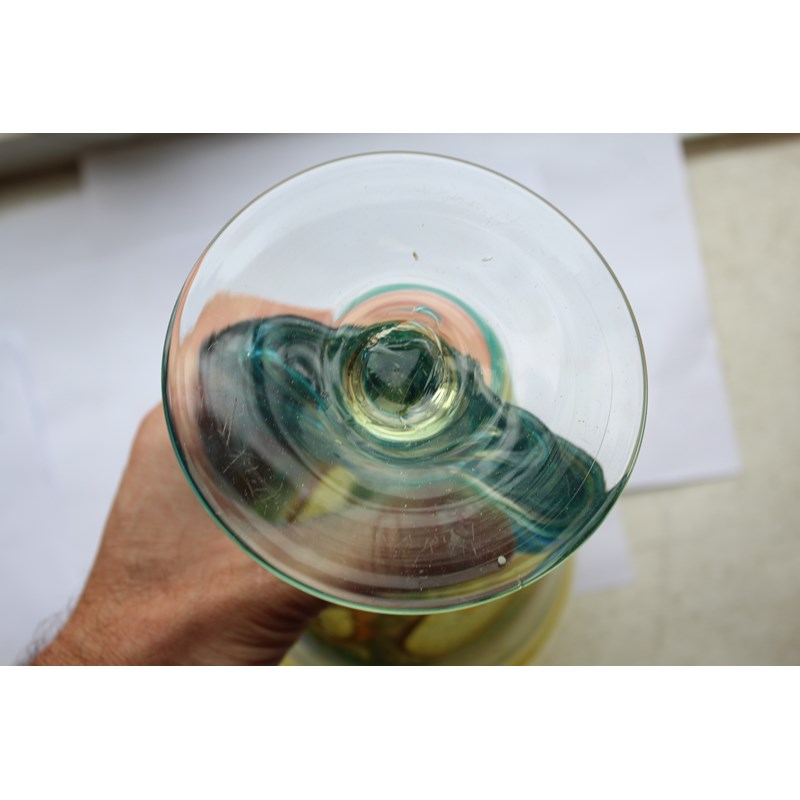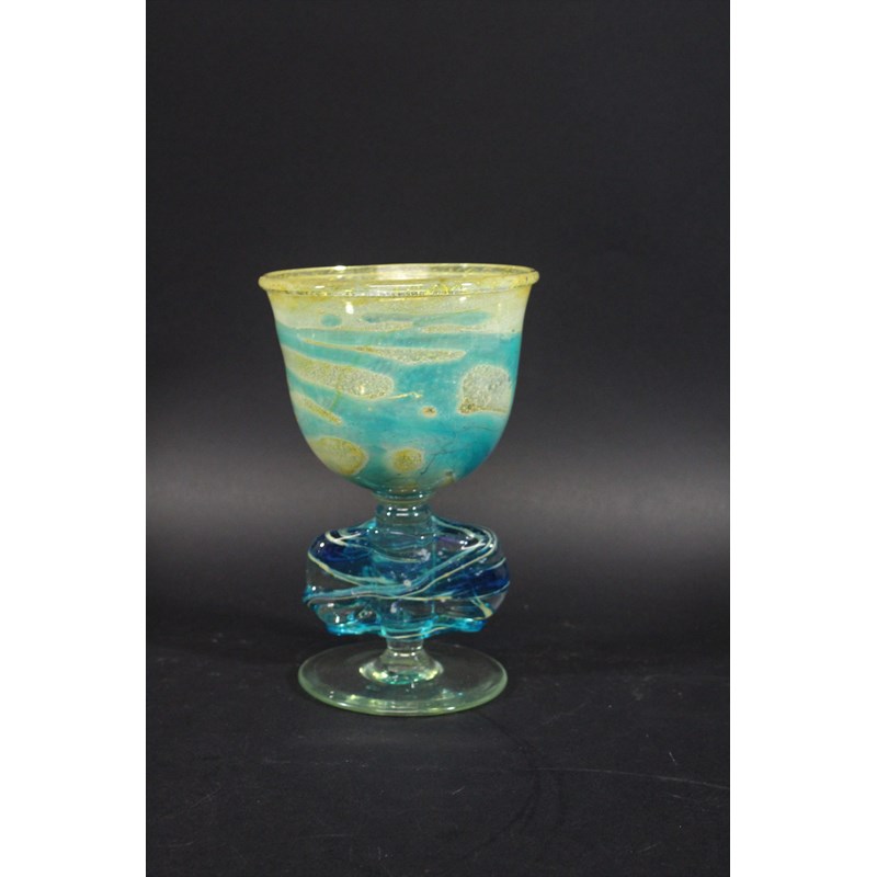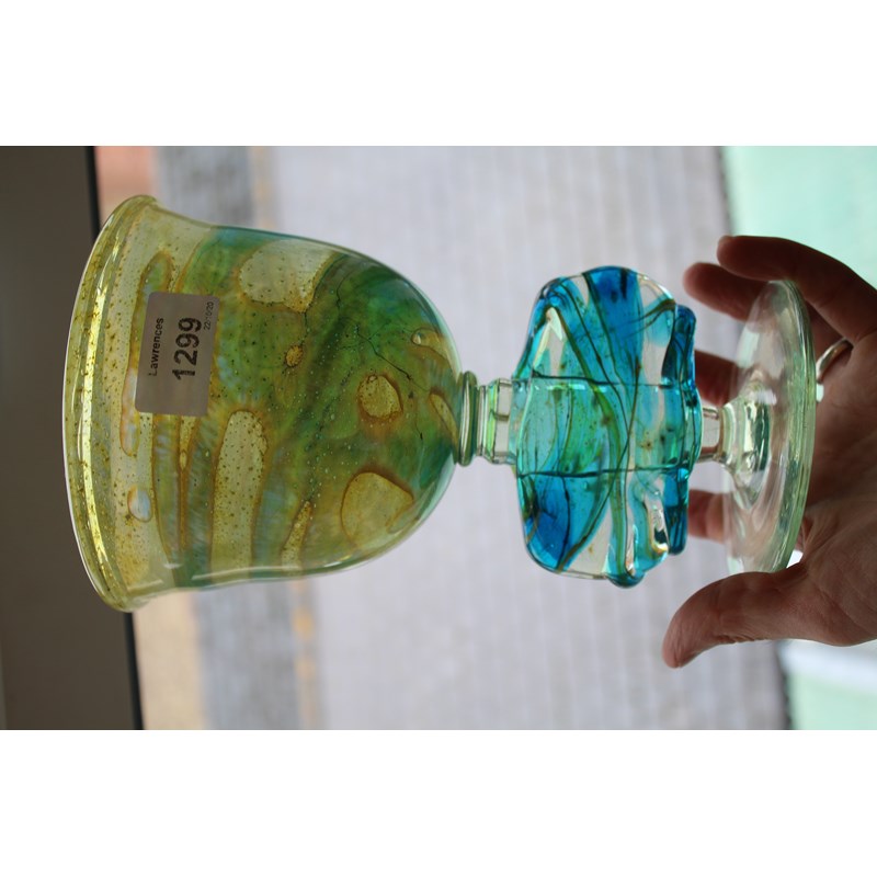 probably by Michael Harris, the large goblet with a swirling design to the bowl and raised on a single knop stem. Unmarked, 22cms high