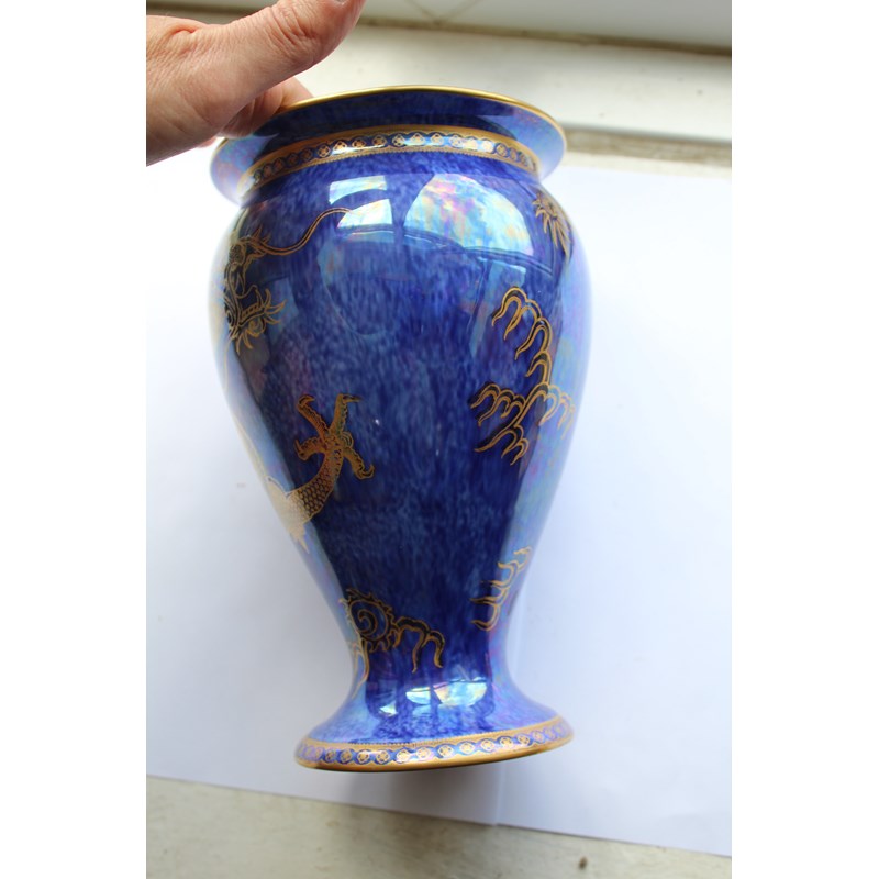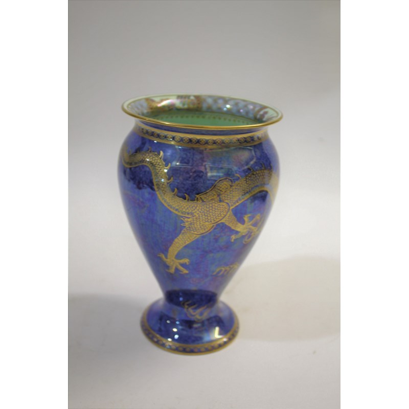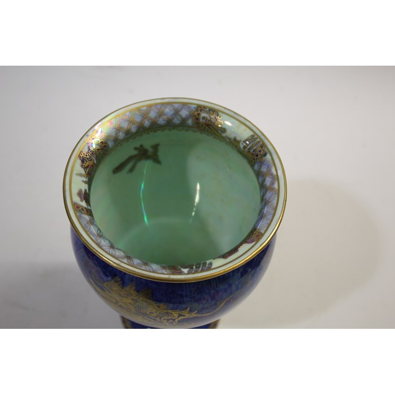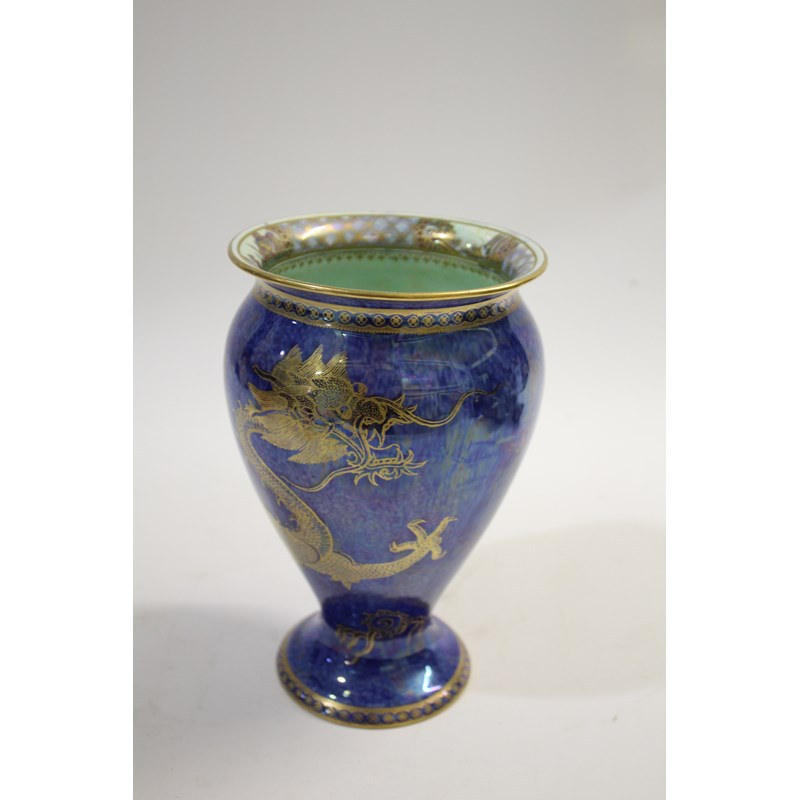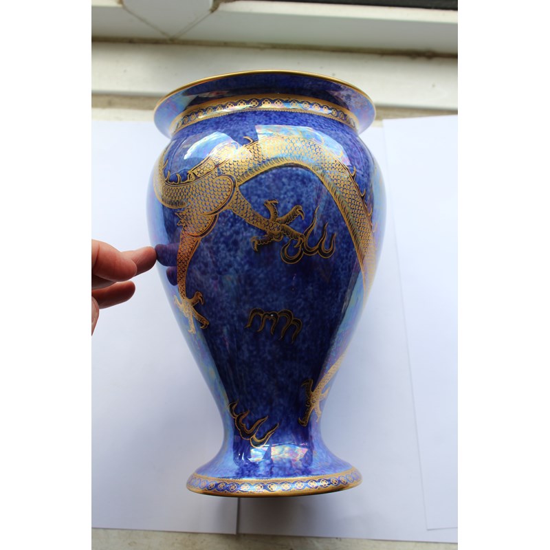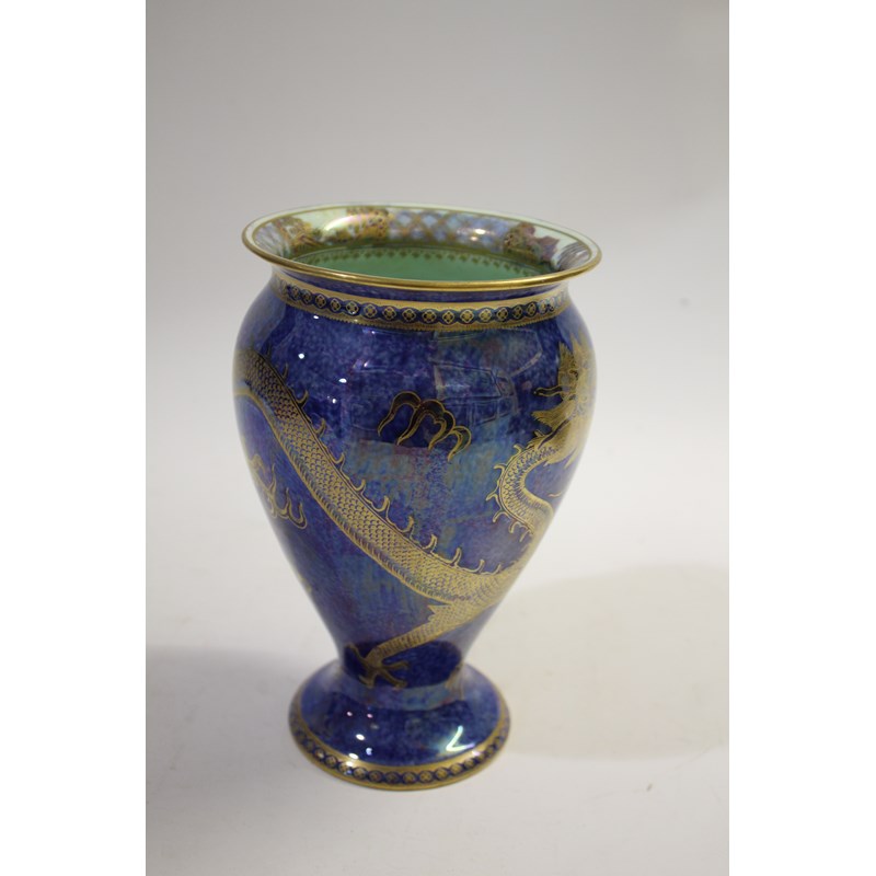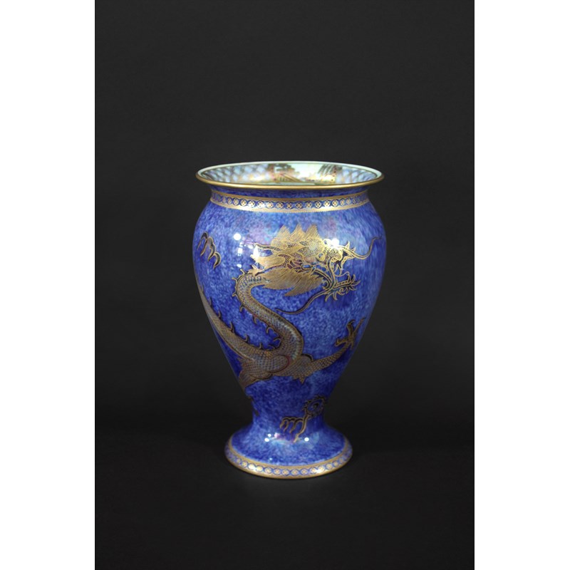the exterior of the vase with a Dragon on a mottled blue ground, the interior with further Dragons on a turquoise ground and buildings on the inside of the rim. Marked, Wedgwood, England. 23cms high