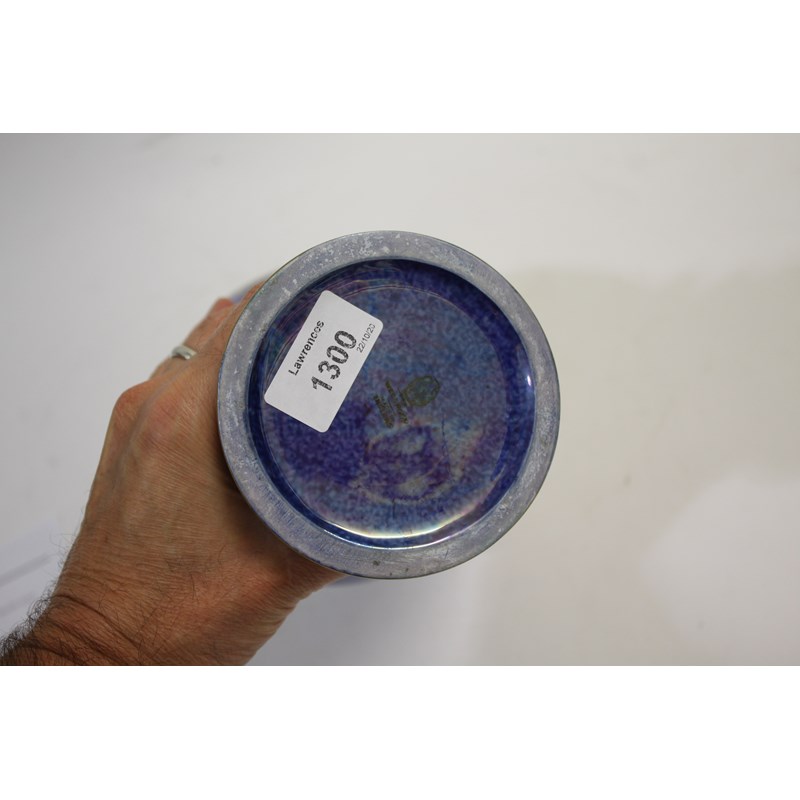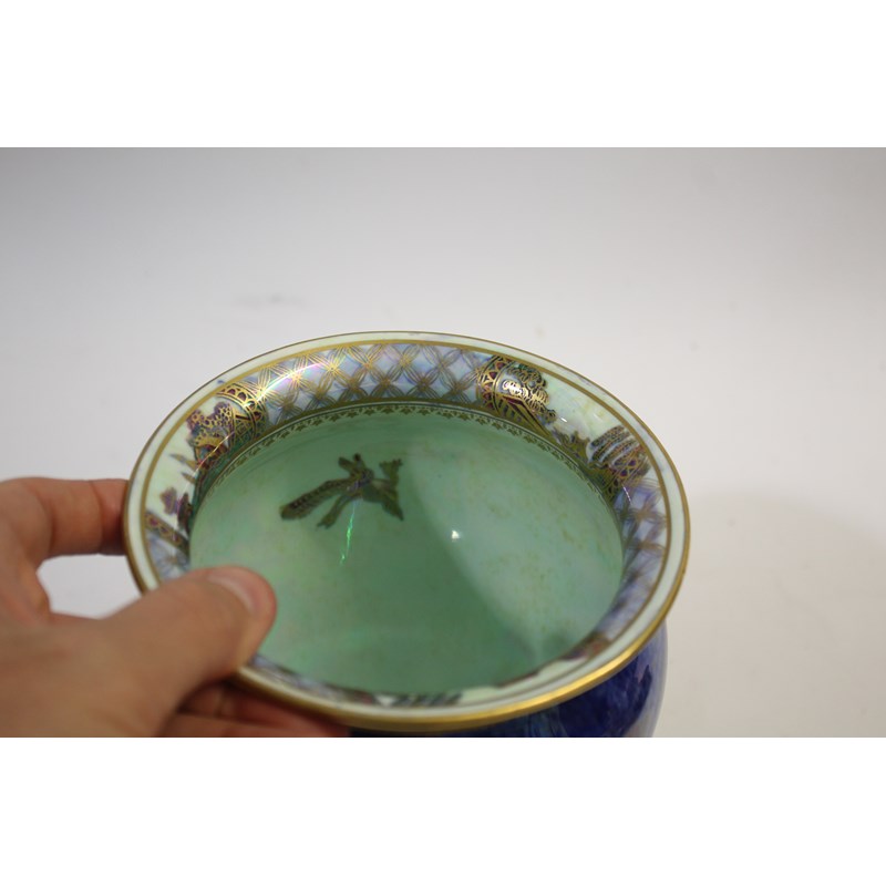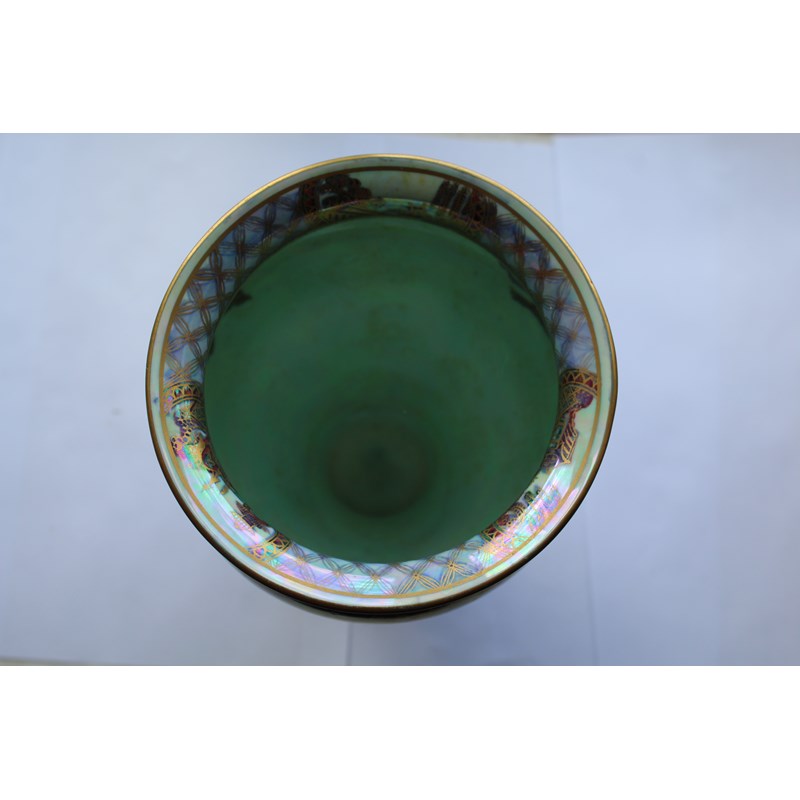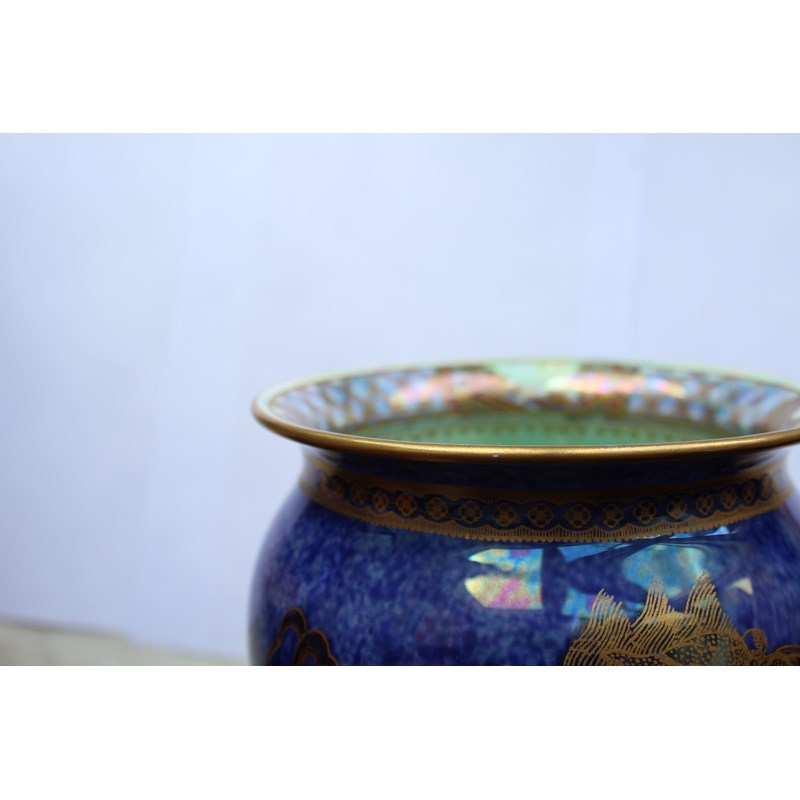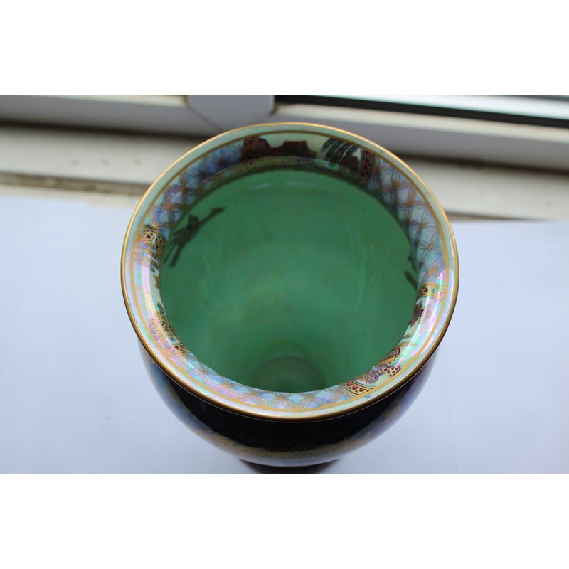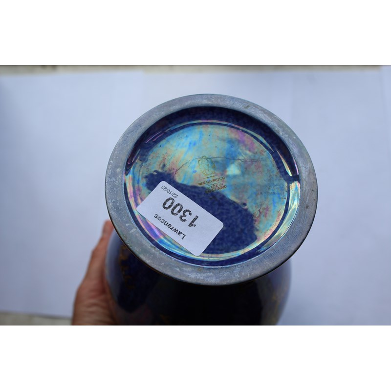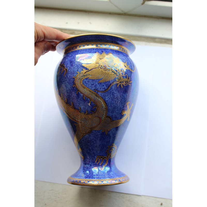 the exterior of the vase with a Dragon on a mottled blue ground, the interior with further Dragons on a turquoise ground and buildings on the inside of the rim. Marked, Wedgwood, England. 23cms high